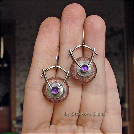 Серьги среднего размера с аметистами (4 мм), лёгкие, выполнены из патинированного серебра и меди.