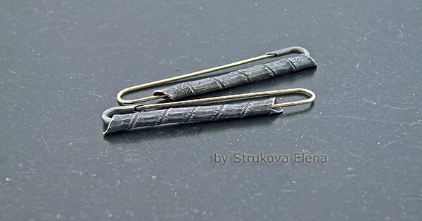 Серьги-булавки среднего размера, тонкие, изящные. Выполнены из патинированного серебра и золота, крючки из gold filled.