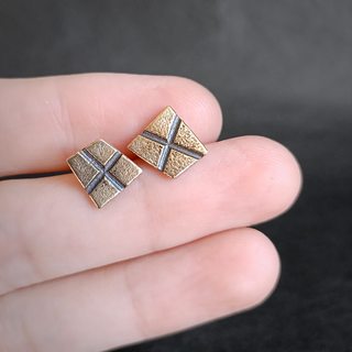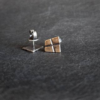 Асимметричная пара серёг с прямыми линиями и углами, выполнена из белого металла, декор из латуни. Крепление — гвоздик, расположенный в центре площадки.