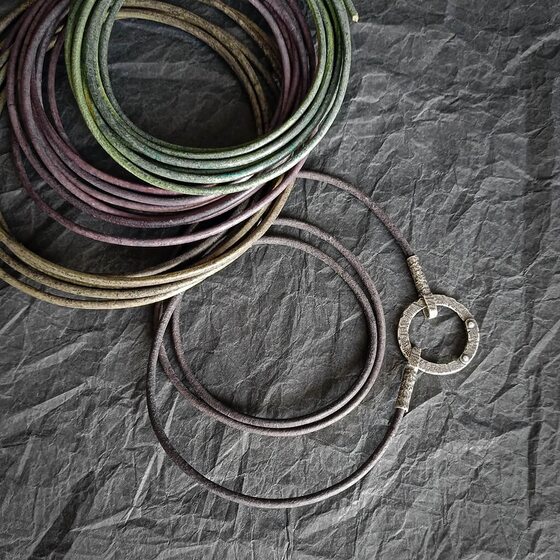 Кожаные шнуры диаметром 1,8−2 мм, матовые, с эффектом потёртости, приглушённых оттенков. Цвета: тёмно-серый (практически чёрный), хаки, зелёный, фиолетовый, оранжево-коричневый.