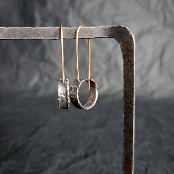Серьги без вставок на длинных крючках из белого фактурного металла и голдфилда.