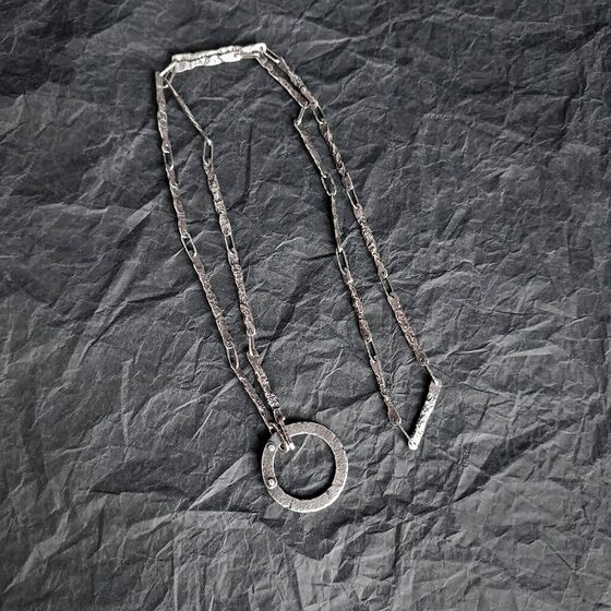 Цепь с крупным съёмным замком, на который можно крепить кулон, выполнена из белого металла, патинирована.